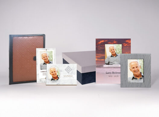Includes memorial register book, 100 tri-fold memory folders (with 7 photos), 50 premium acknowledgement cards with photo, a bookshelf box, photo book, and memory box