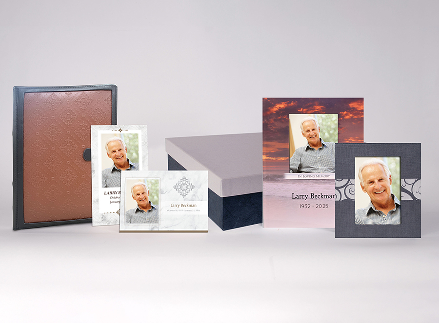 Includes memorial register book, 100 tri-fold memory folders (with 7 photos), 50 premium acknowledgement cards with photo, a bookshelf box, photo book, and memory box